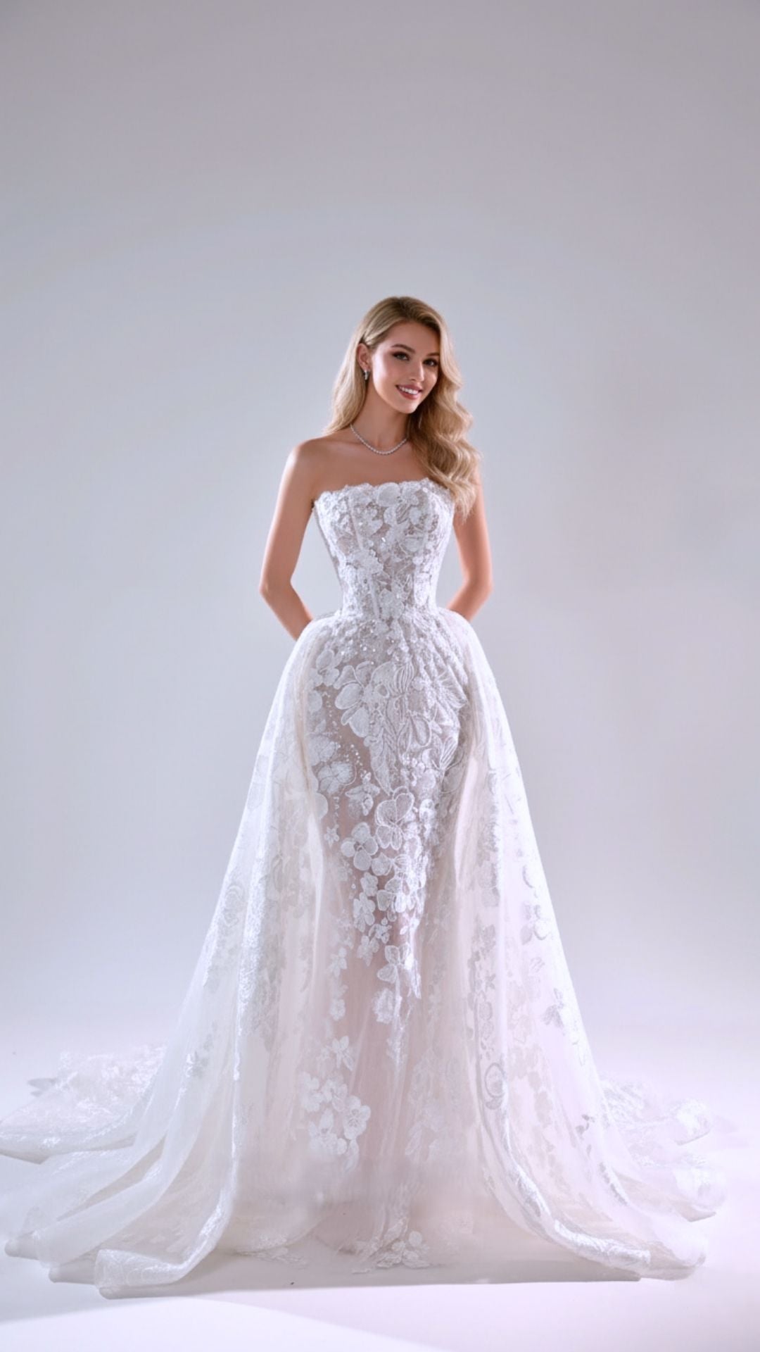Elevate your gown with our handcrafted veils, detachable sleeves, and overskirts. The perfect finishing touch for your big day.
